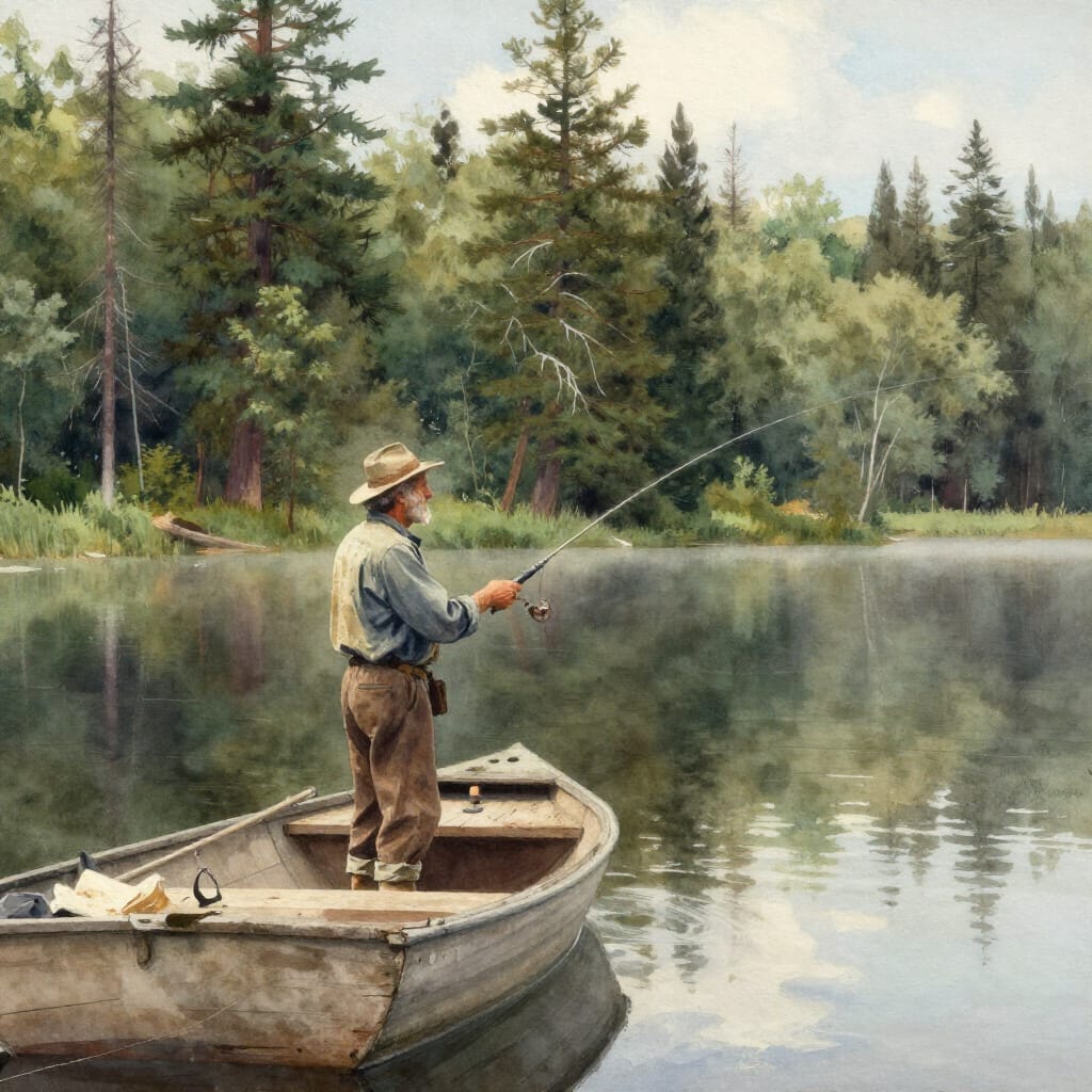 A grizzled fisherman casts his line from a weathered wooden boat.jpg