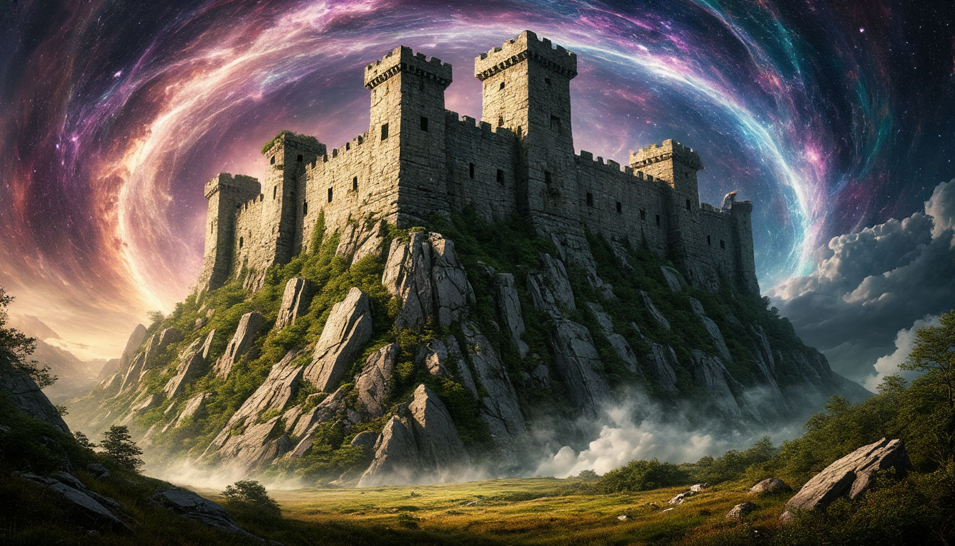 A colossal, ancient stone bunker, partially reclaimed by nature, emerges from a swirling vortex of cosmic energy.jpg